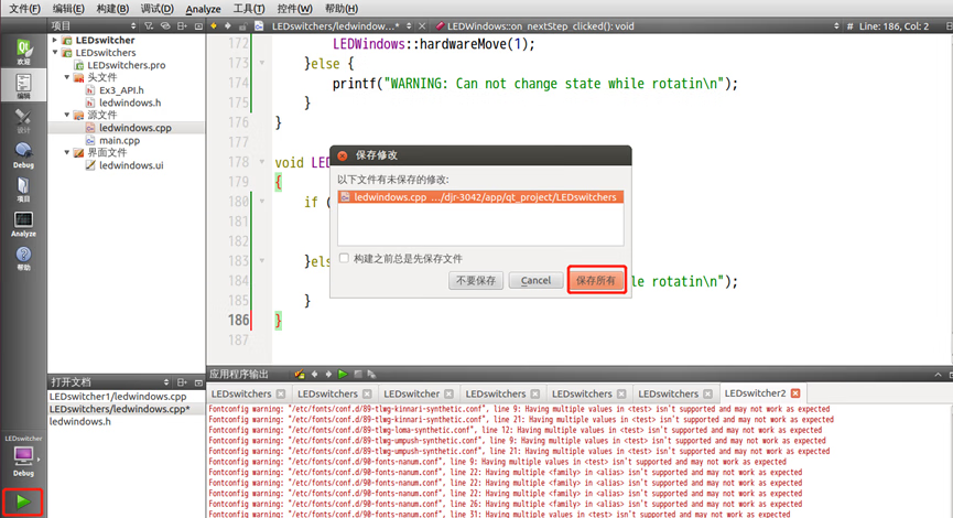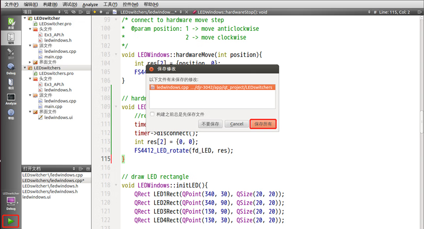 void LEDWindows::on_LED4_clicked() { if(!isRotated){ if (LEDWindows::toggleLEDState(4)) FS4412_LED_switch(fd_LED, 4); else printf("ERROR: Can not toogle LED state!\n"); }else{ printf("WARNING: Can not change state while rotating\n"); } }仿造上一步的操作添加其他LED按键的逻辑代码,代码如下(注意对应关系)
