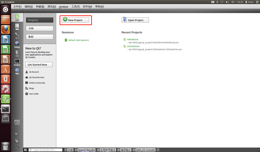 打开qtcreator, 单击左侧菜单“欢迎”,然后点击中间“New Project”