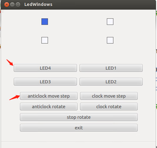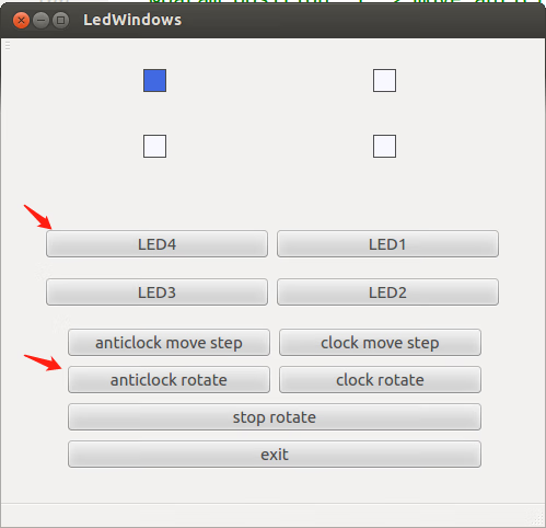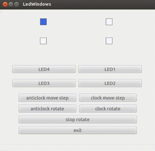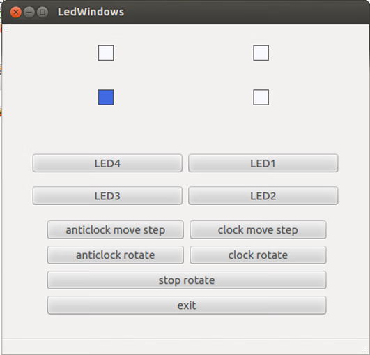 // move step util void LEDWindows::moveLEDLeft(){ bool tmp = states[0]; for (int i = 0; i < 3; i++){ states[i] = states[i + 1]; } states[3] = tmp; update(); return; } void LEDWindows::moveLEDRight(){ bool tmp = states[3]; for (int i = 3; i > 0; i--){ states[i] = states[i - 1]; } states[0] = tmp; update(); return; } /* connect to hardware move step * @param position: 1 -> move anticlockwise * 2 -> move clockwise */ void LEDWindows::hardwareMove(int position){ int res[2] = {position, 0}; FS4412_LED_rotate(fd_LED, res); }点击运行,保存所有,执行图2逆时针移步操作,结果如图3所示。顺时针同理