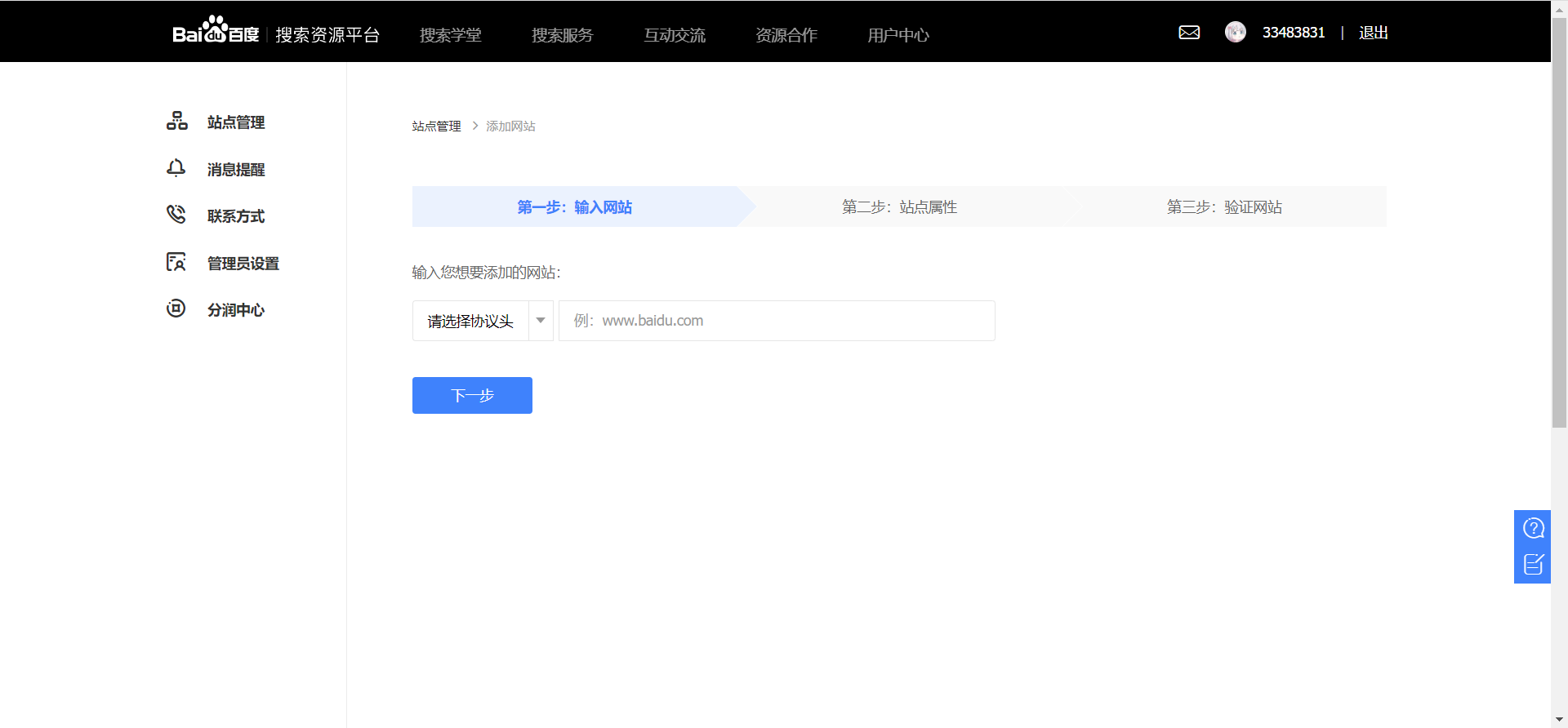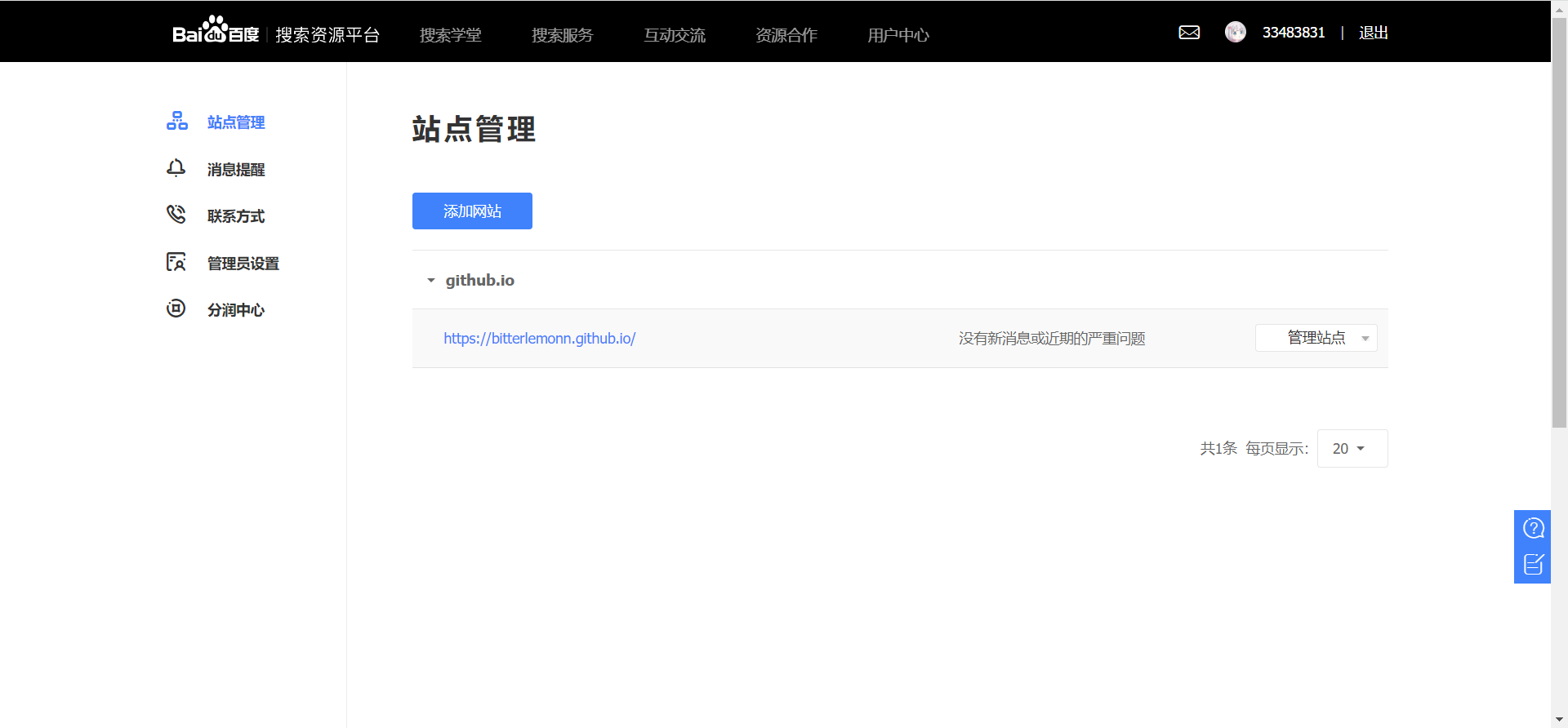 首先我们需要上百度资源中心申请成为我们博客的站主,官方网址点这里。进入界面后点击添加网站,根据提示填写相关的信息