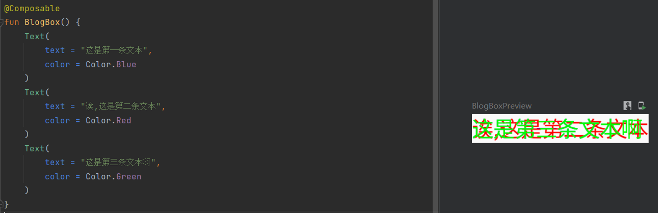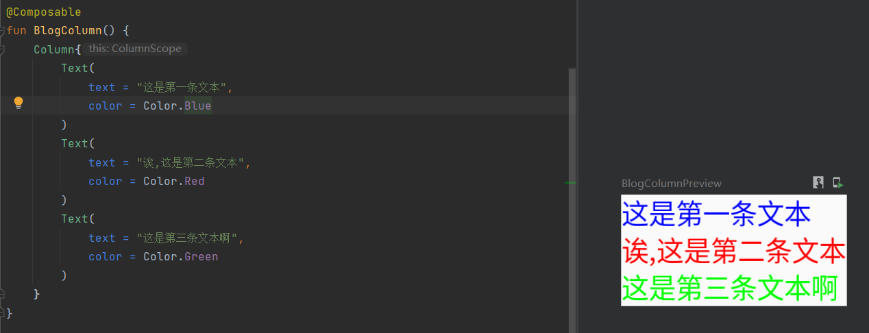 线性布局也是View中比较常用的一种布局,可以实现控件按照水平或者垂直的顺序显示。在Compose中将线性布局的方向分为了两个布局控件。行布局(Column)控件可以使被包含的控件每一个单独一行显示,即纵向排列,如下是Column布局最简单的用法: