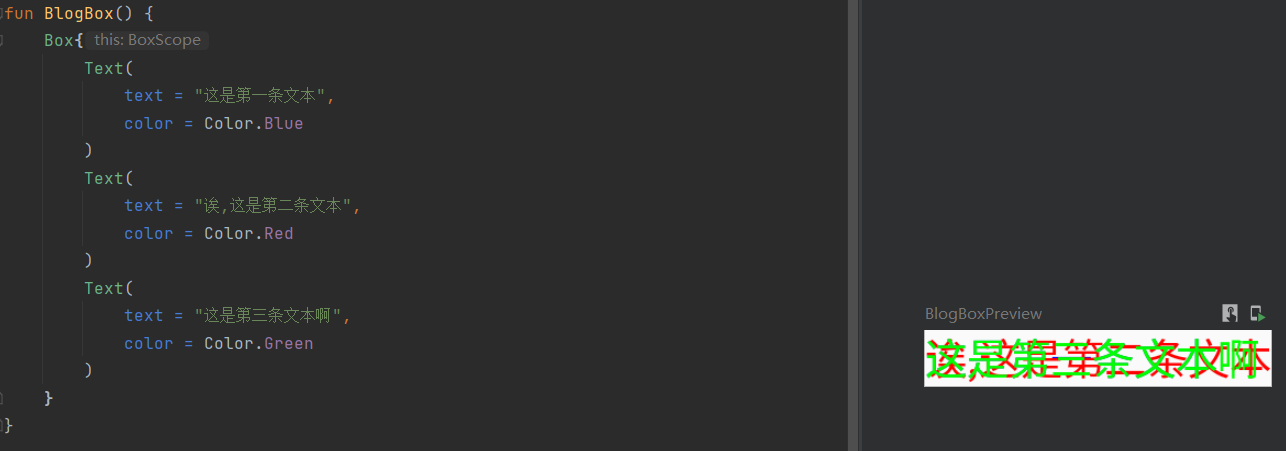 但是这不是和没有使用布局的情况一模一样吗?在Compose中如果不使用布局文件时默认是一个布满屏幕的Box布局,所以如果单纯使用Box布局的话是与不使用布局是一致的。