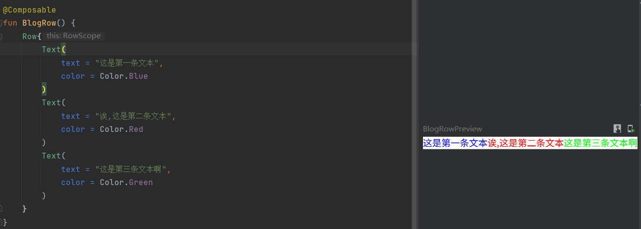 在Compose中横向布局是使用Row布局控件实现的,与Column布局类似,Row布局可以使包含在其中的控件以每个一列的方式显示即横向显示。如下是Row布局最简单的用法: