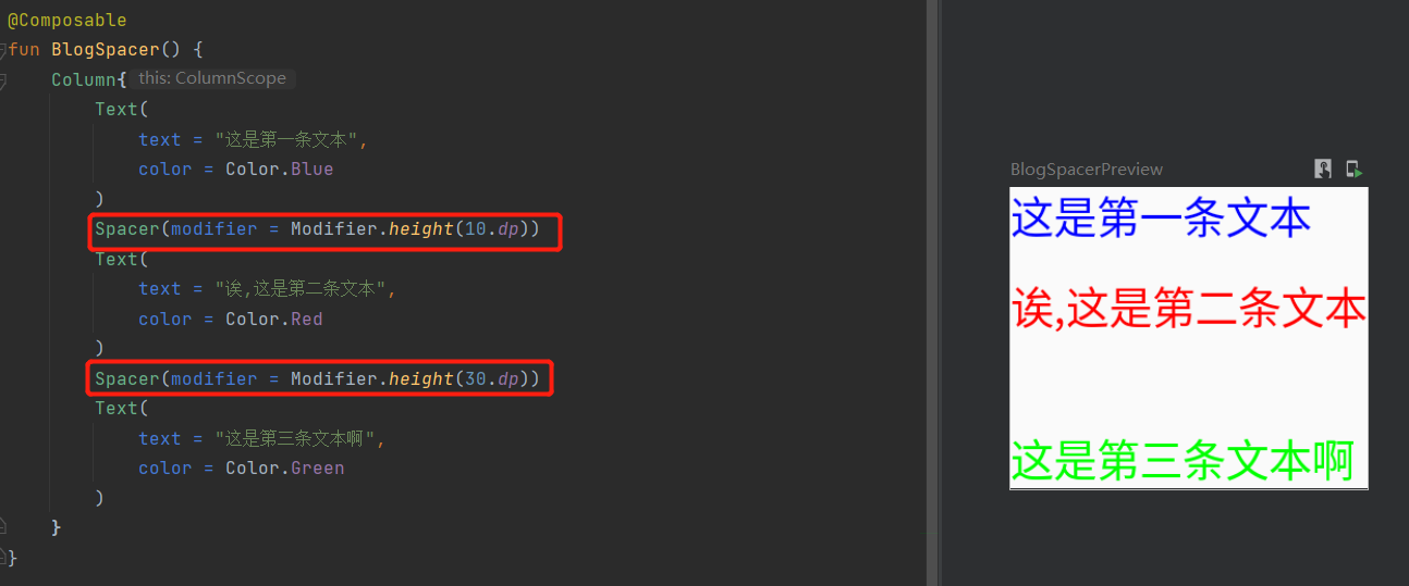 Compose中不仅仅可以使用传参的方式调整控件间的间距,如果需要单独控制两个控件之间的间距时可以使用Spacer控件自由的控制间隔的大小。Spacer最简单的用法如下,例如实现一个间隔不相同的纵向线性列表。