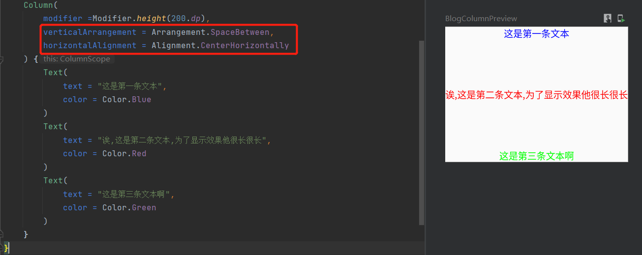 Column布局也可以两个参数verticalArrangement和horizontalAlignment,这两个参数分别定义了Column布局在纵向的布局方式以及在横向的对齐方式,例如下图实现了一个控件间等距(无边距),水平居中的纵向线性布局:
