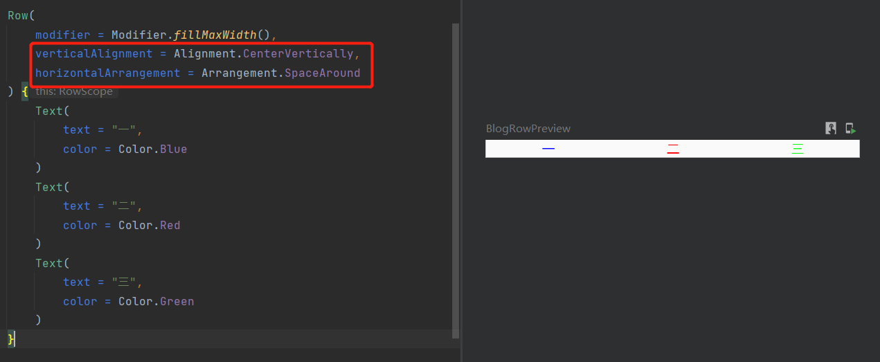 与Column布局类似可传入的值相同,唯一不同的是在verticalAlignment中居中使用的是Alignment.CenterVertically(垂直居中)