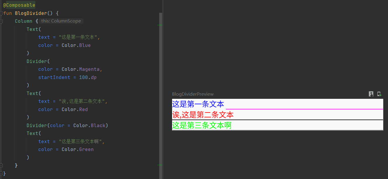 Compose提供了一个分割线的控件Divider,这个控件可以快速的满足需要分割线的情况。Divider控件还可以传入两个参数color和startIndent分别控制分割线的颜色以及分割线的起始偏移,下图在纵向布局中加入了一条起始偏移为100dp的品红色分割线和一条黑色分割线: