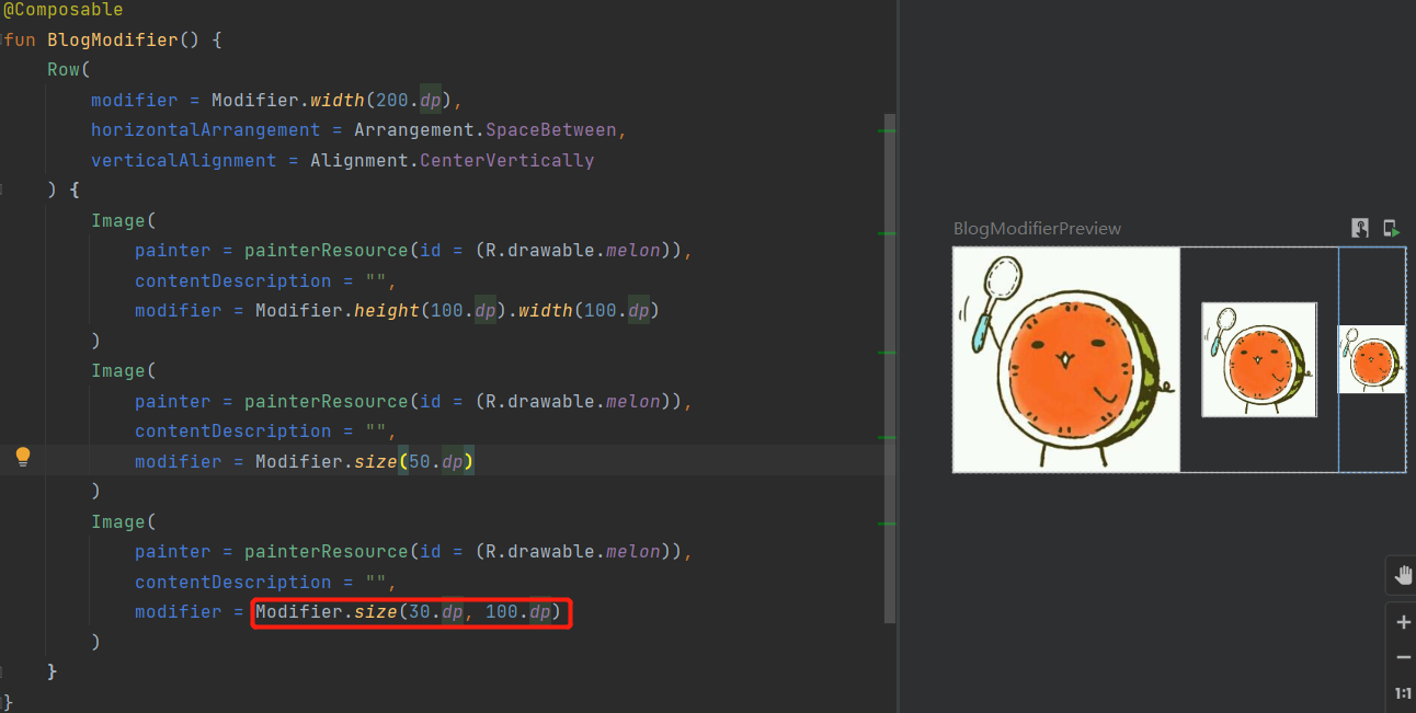 Modifier使用最多的是控制控件或者布局的尺寸,使用Modifier.height可以控制控件的高度,使用Modifier.width可以控制控件的宽度。也可以使用Modifier.size(width, height)的方式控制宽高,当使用Modifier.size(size)时表示控件宽高一致。传入的值类型都为DP,在Compose中为Int等数值类型创建了一个拓展方法Int.dp.可以将Int等数值类型转为DP。
