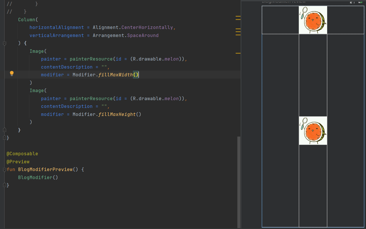 特殊地,使用fillMaxWidth/fillMaxHeight可以实现AndroidView中的matchParent的效果,如下图实现了一个横向填满以及一个纵向填满的Image: