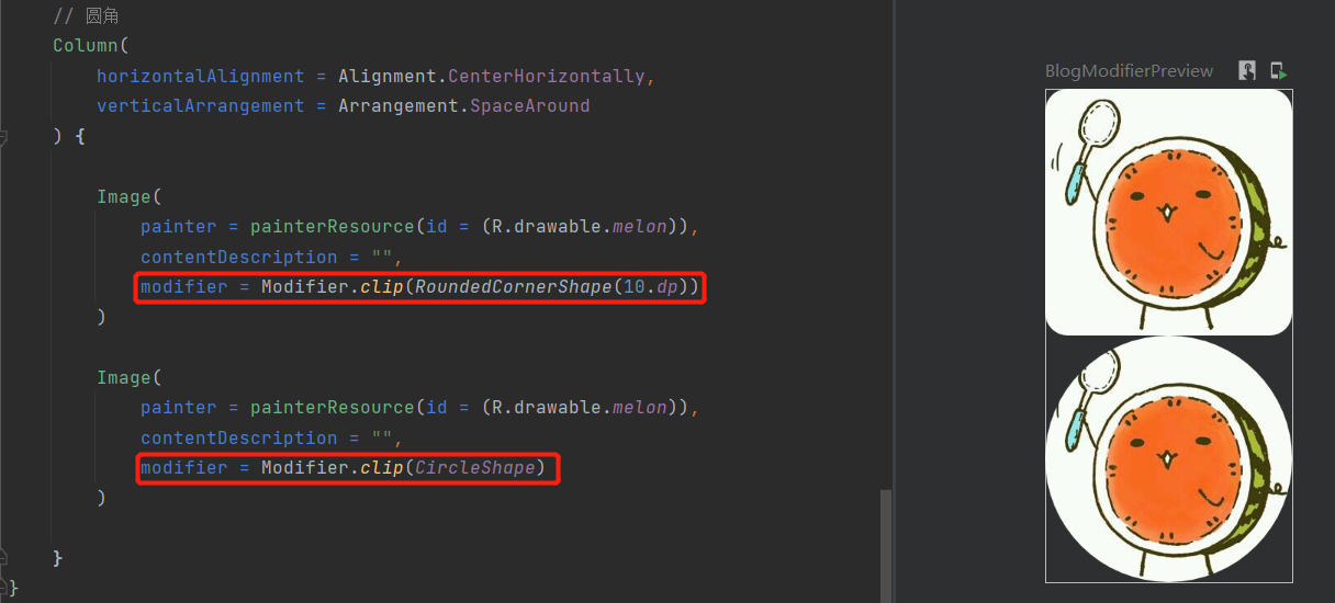在平常的设计中经常会用到圆角或者圆形的图片,在AndroidView中实现这种功能比较麻烦,一般是使用自定义View的方法去实现。但是这种方法十分麻烦,所以通常是采用第三方的库来实现圆角或者圆形的图片。但是在Compose中Modifier提供了切割(Clip)的功能,通过该功能我们可以很方便的将图片切割成想要的形状,并且Compose中还内置了圆角以及圆形的形状。下图实现了一个四角圆角为10dp的图片以及一个圆形图片: