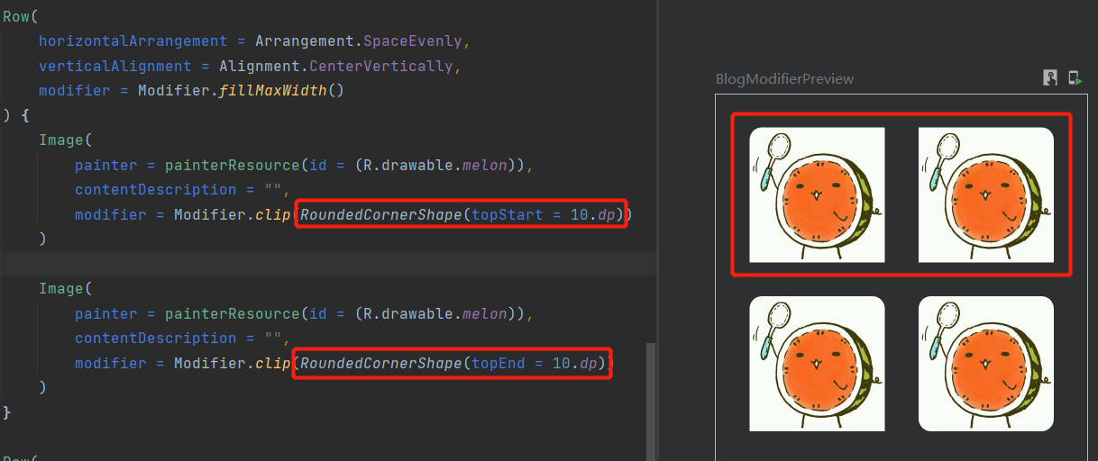 对于RoundedCornerShape它不仅仅可以对图片四角同时操作也可以单独控制一个圆角,下图实现了单独操控图片圆角的效果